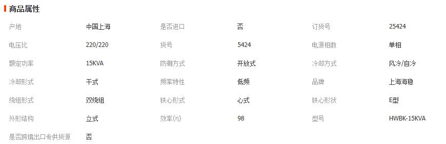 海稳产品性能参数: ※ 技术参数相数单相三相容量0.25KVA-300KVA5KVA-5000KVA输入电压1φ 220V/110V/等各种电压1¢/3φ220V/380V/690/415等各种电压输出电压根据用户需求订制各种电压输出电压准确性±1%电压变动率≤1.5%输出波形失真度无失真(与输入波形比较)绝缘等级F级、H级、HC级可供选择(常规为H级)工作效率≥97%适用频率50/60Hz联接方式Y/△任益组合(隔离变压器)过载能力允许超过1.2倍额定负载工作4小时(可长期满载)噪声≤35dB(一公尺内)温升≤60℃绝缘电阻≥150MΩ抗电强度3000VAC/1min设计寿命30年工作环境温度:-20~+45℃湿度:≤95%RH不结露工作场所无腐蚀性气体及导电粉尘安规标准产品符合VDE0550、IEC439、JB5555、GB226等国际标准冷却方式干式风冷备货情况10~100KVA标准机型均备有现货,所有规格均以标准化生产,价格相当合理。