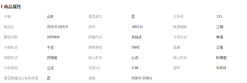 山东江恒变压器有限公司(聊城老变压器厂)主导产品有:35kv、20000kvA及以下S20、S22、S13、SH15等系列油浸式、干式变压器。10KV6KV变压器、SH15非晶合金系列电力变压器.SCB12、SCB14 SCB18 SCBH9、系列树脂绝缘干式变压器、预装式变电站(欧、美式)高低压开关柜等。并可按照用户要求设计生产特种变压器、非标变压器贴牌生产。现年生产能力500万KVA,成套设备3500台套。其产品全部通过国家变压器质量检测测验中心型式试验和特殊试验及“两部鉴定”。公司常年为电力部门、企事业单位、厂矿企业、提供优质的变压器。所有的变压器产品均通过国家有关部门的鉴定和电力主管部门的认可。 在生产主要硬件和关键软件的采用上坚持高起点、高水平,产品各项质量指标均达到国内水平。凭借雄厚的资金及技术力量,公司经过多年的积累和沉淀,热忱为广大用户提供产品及优质的服务。