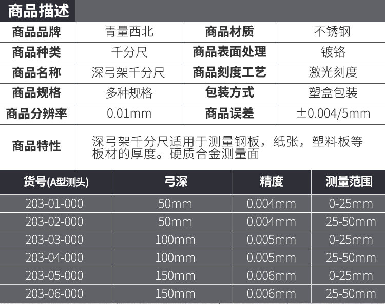 青海青量深弓架千分尺 板厚千分尺 异型外径千分尺 0-25*50 100mm