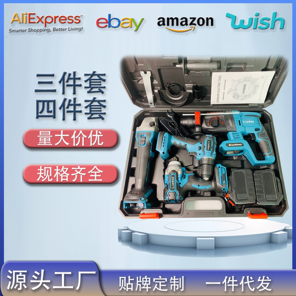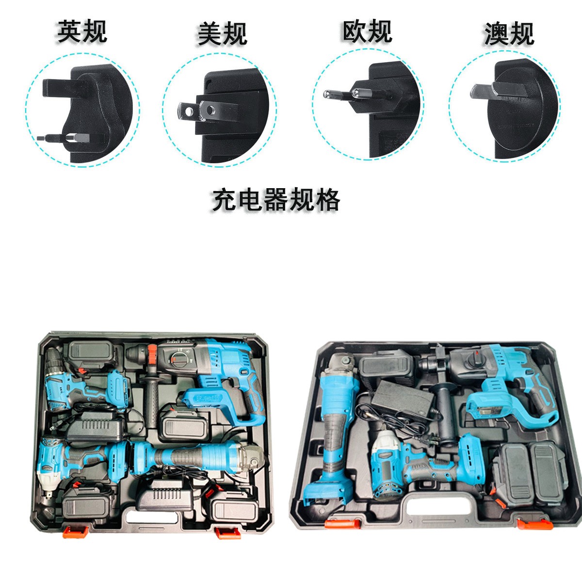 跨境外贸 锂电工具4件套 3件套 扳手 电钻 角磨机 电锤 电动工具