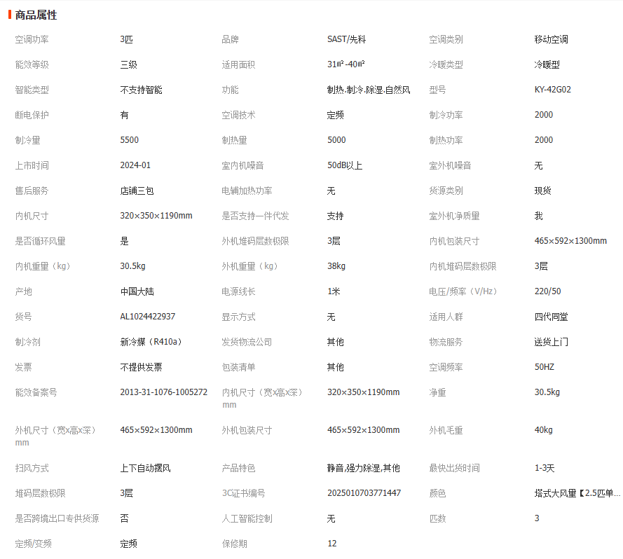 先科移动空调冷暖两用3匹柜机式单冷家用 出租房宿舍无外机免安装