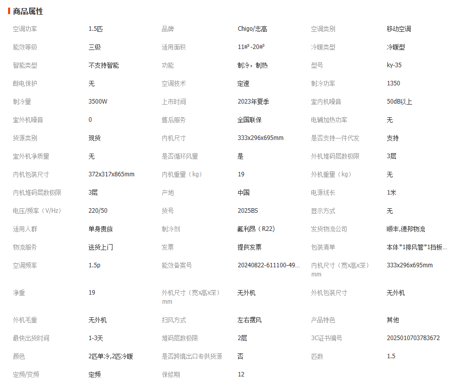 志高可移动空调冷暖一体机无外机单冷免安装式厨房便携制冷小空调