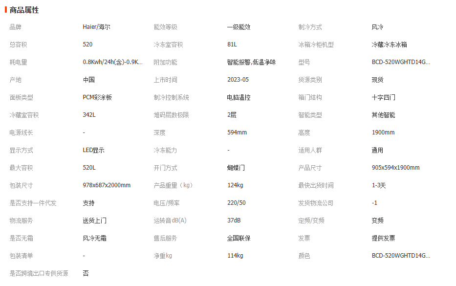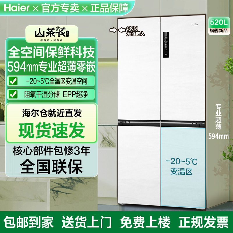 海尔山茶花520L双开四门全空间一级594超薄零嵌入式家用风冷冰箱