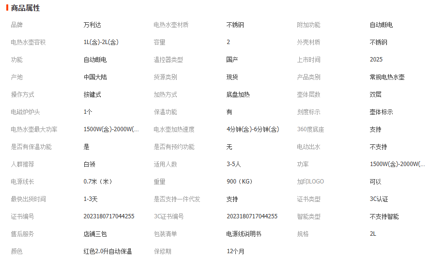 万利达2.0升高端电热水壶不锈钢大功率双层保温复古烧水壶保温壶