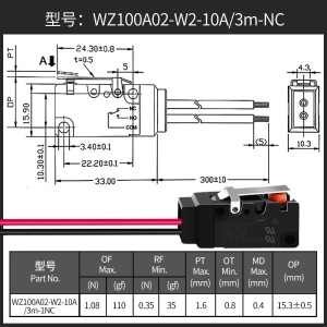微动开关2脚线防水防油1常闭1NO压下断开燃气灶行程限位开关恒科 1个