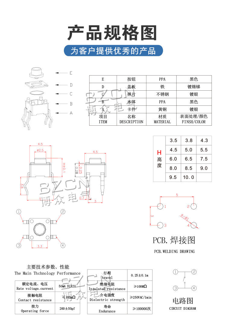 博众TS-C016 轻触开关4.5*4.5*3.5-10插脚 立式微
