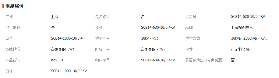 SCB14-30kva~2500kva/10/0.4kv干式变压器技术参数表