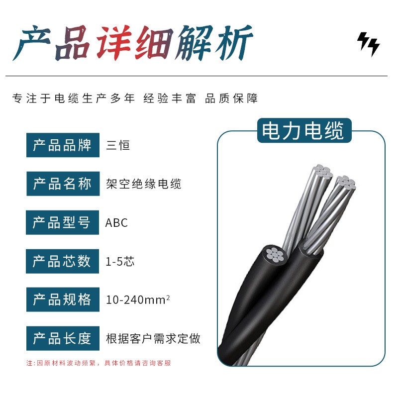 jklyj 生产加工XLPE绝缘ABC铝芯电缆架空线2*525平 方铝线 架空线 1米