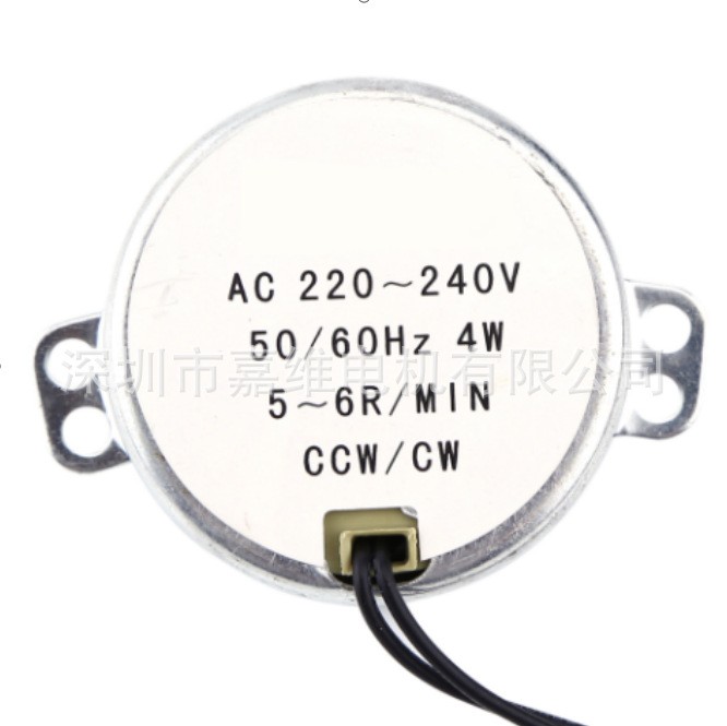 4W,寿命长,适用范围广,常用电源电压AC6V、9V、12V、24V、110V、220V,转速有每分钟1.4R、2R、3R、4R、5R、8R、10R、15R、20R、30R、50R、60R,转速越小扭力越大,特殊输出轴可订做。