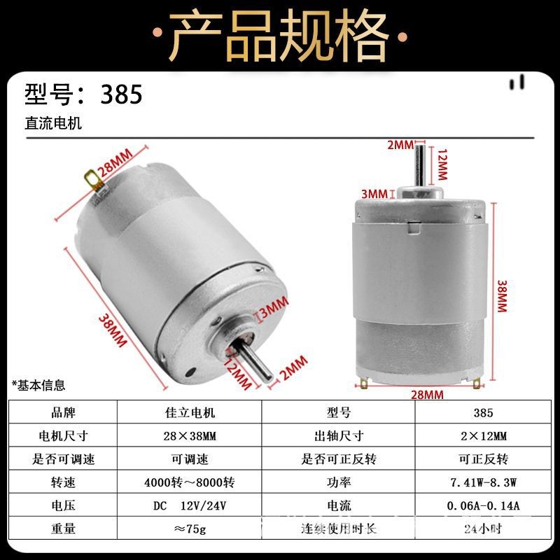 385强磁碳刷12V24V微型直流高速电动机大功率小马达吹 风筒DIY专用 1个
