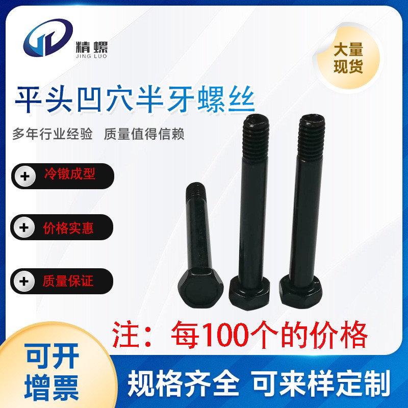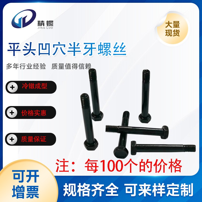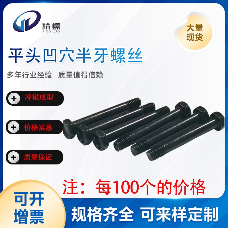 HM六角平头凹穴半牙螺丝钉螺杆HM6*45碳钢环保黑锌螺丝钉