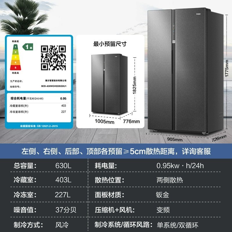 海尔630L对开门双开门超大容量一级变频节能风冷无霜冰箱家用官方