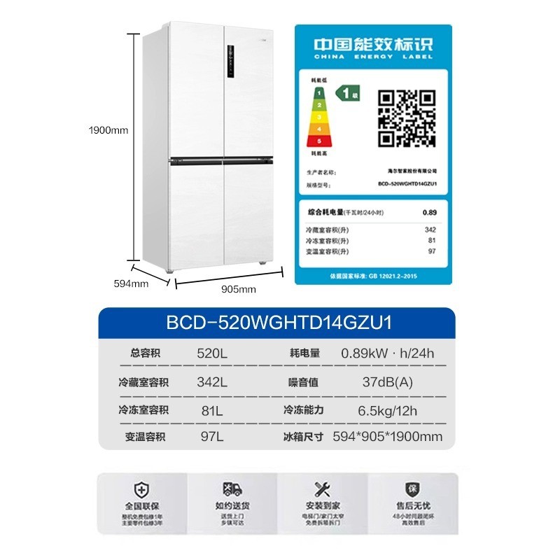 海尔山茶花520L双开四门全空间一级594超薄零嵌入式家用风冷冰箱