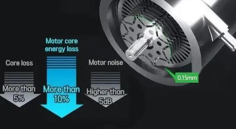 粘结铁芯采用胶水粘接的方式,替代传统的焊接和叠铆的方式,通过这种方式的改良的目的,就是提升电机的电磁性能,降低定转子铁芯的铁损伤。粘结铁芯非常适合超薄的叠片,胶水可以将堆叠粘合在一起,而避免层压带来的叠片变形。粘结铁芯钢板之间的胶黏剂形成绝缘层,可以显着降低电磁损耗,粘结铁芯的抗震性能和防水性能更强。