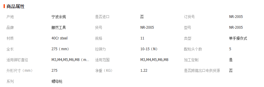 本品为手动拉铆螺母枪,又称手动拉帽枪、手动铆螺母枪,适用于各类金属、非金属薄板的铆螺母安装与紧固作业。产品采用优质钢材制造,结构坚固,操作省力,拉力稳定,可快速完成M3~M8规格铆螺母的拉铆安装,广泛应用于钣金、机箱机柜、汽车配件、家具、家电、工程机械、铝合金门窗等行业。